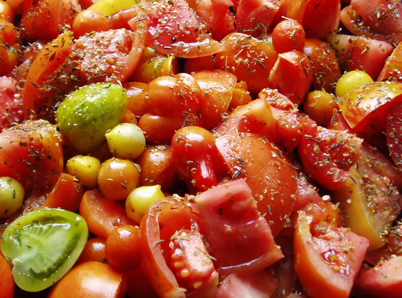 We cleared the tomato plants of their green tomatoes a few weeks back in anticipation of the winter weather. They're now inside and as they ripen up, we've been chopping them, drizzling them with olive oil, sprinkling on some herbs and then roasting them to then be frozen and available throughout the next year for a variety of culinary uses.