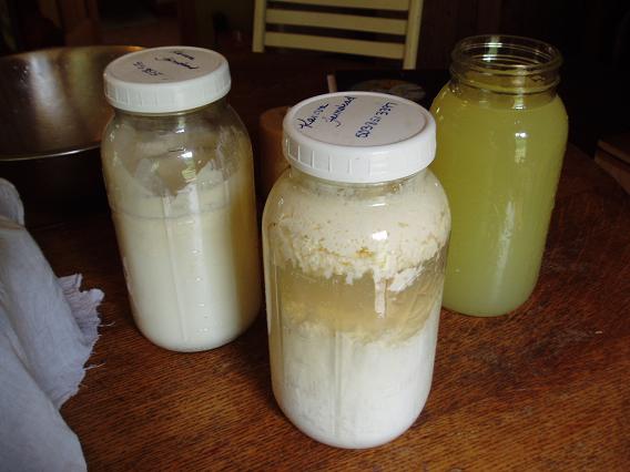The front jar is milk after it's separated and the back right jar is full of strained whey.
