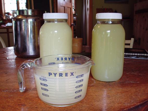 The project's results: over a gallon of fresh whey from raw milk, ready for use in various fermenting projects.